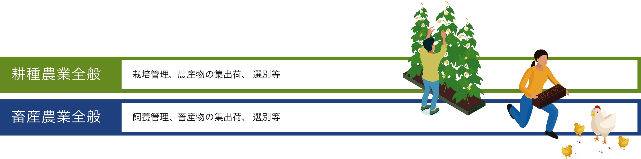 1.耕種農業全般の作業(栽培管理、農産物の集出荷、選別等)