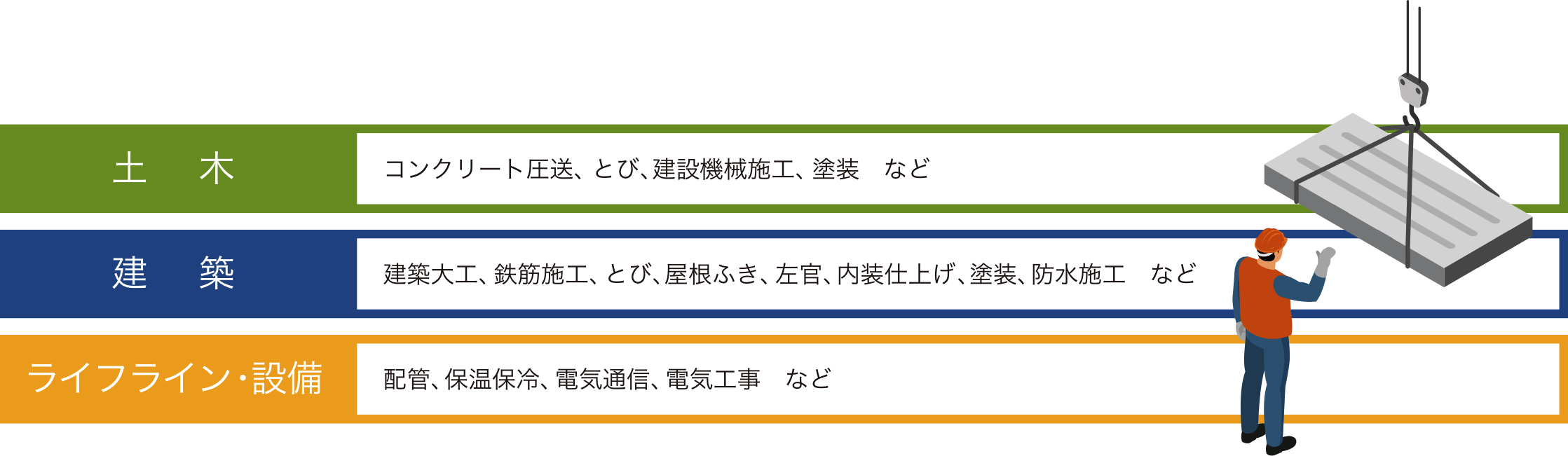 コンクリート圧送、とび、建設機械施工、塗装 など