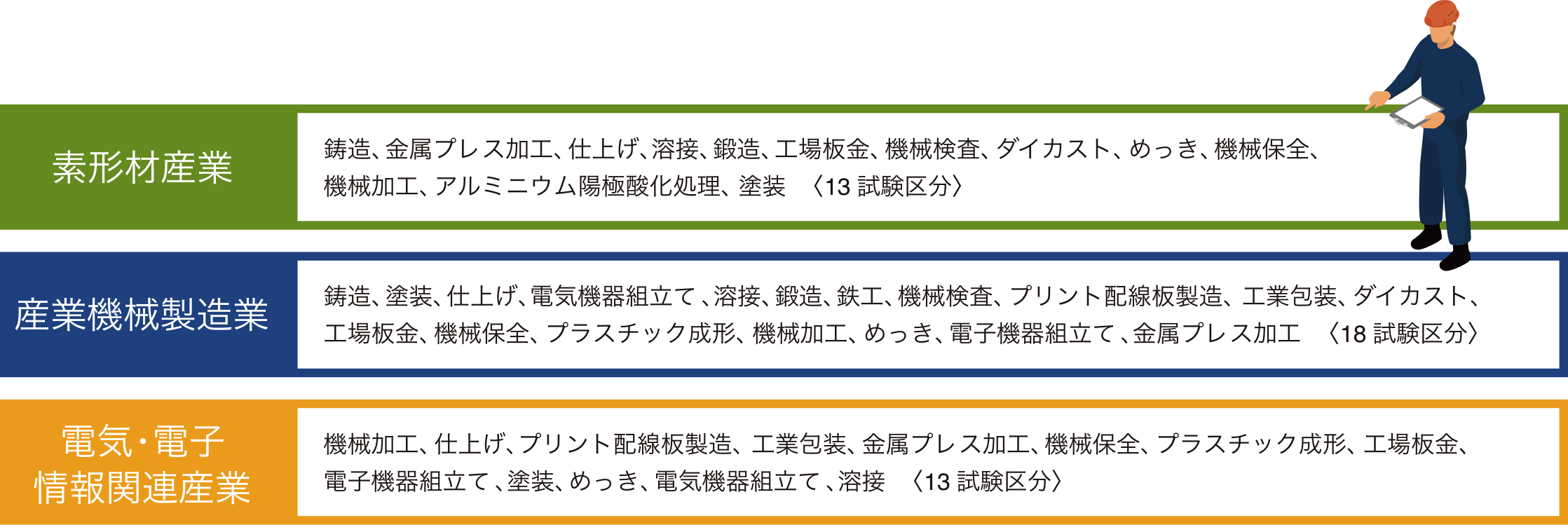 機械加工、仕上げ、プリント配線板製造、工業包装、金属プレス加工、機械保全、プラスチック成形、工場板金、電子機器組立て、塗装、めっき、電気機器組立て、溶接 〈13試験区分〉